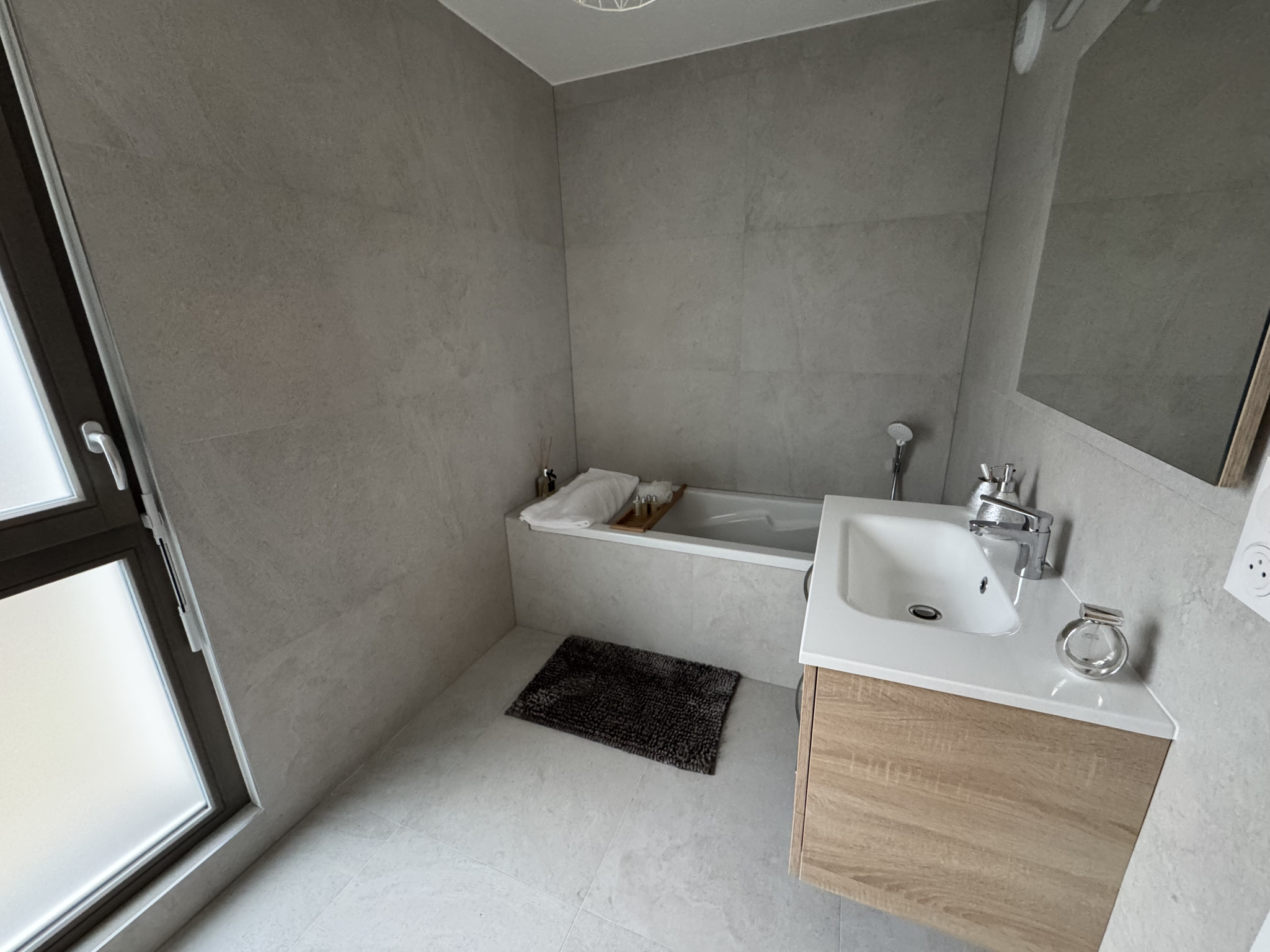 Prestation haut de gamme : chauffage au sol, parquet contrecollé dans les pièces de vie, carrelage en grès cérame dans les salles d'eau, salles de bain entièrement équipées et carrelées toute hauteur, porte palière blindée avec visiophone.