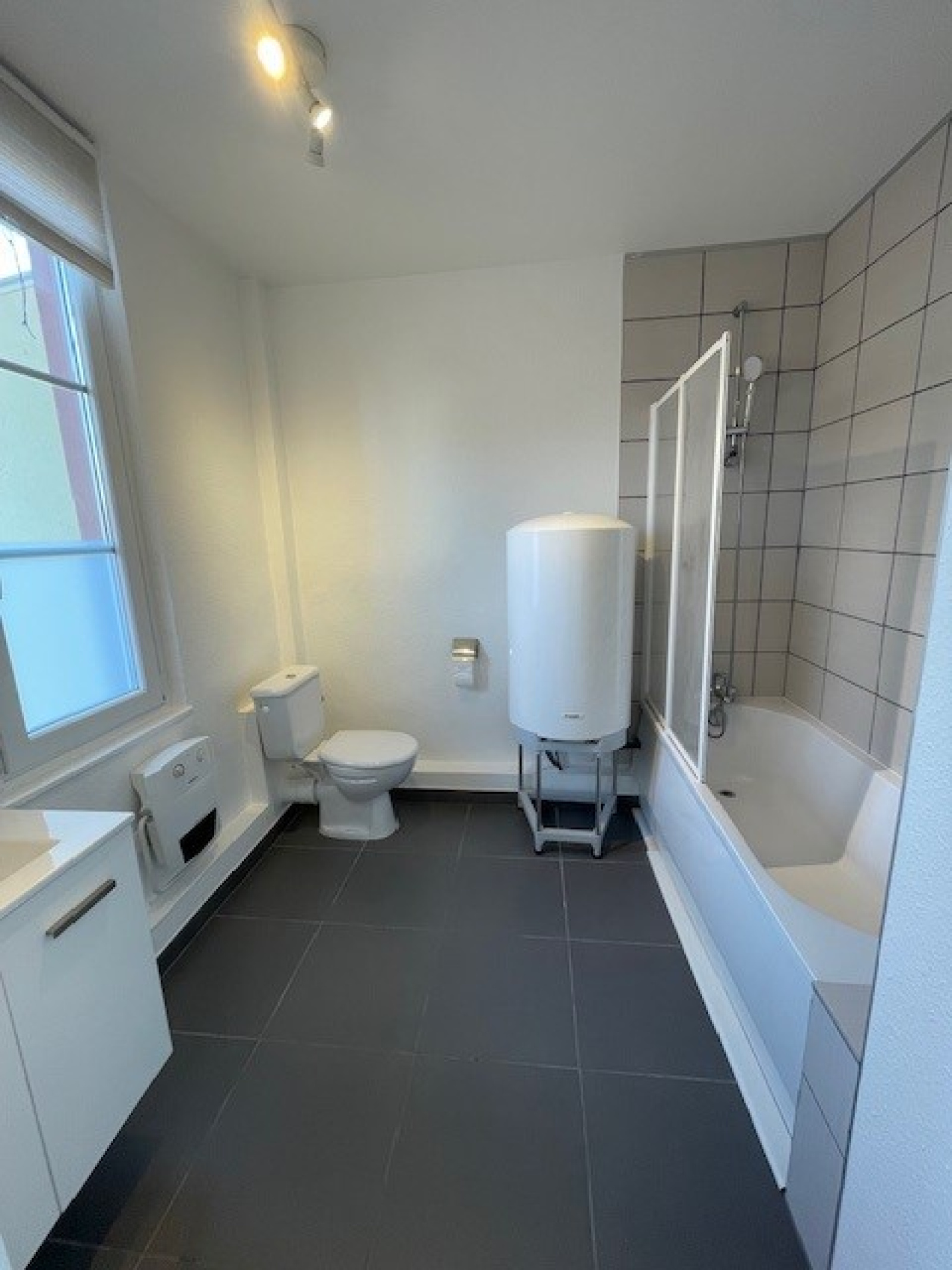 - Une salle de bain avec WC et baignoire