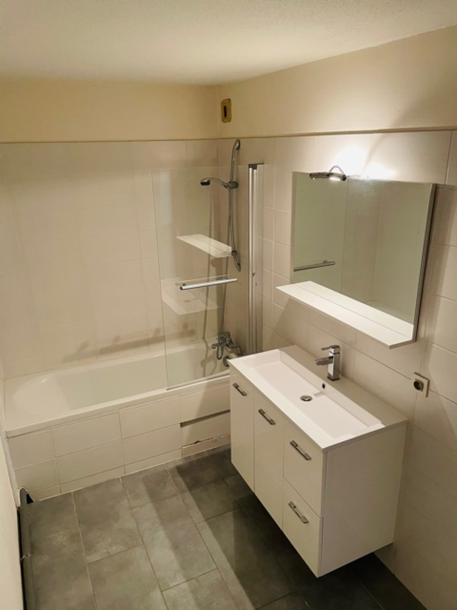 - Une salle d'eau avec baignoire, meuble vasque et sèche-serviette