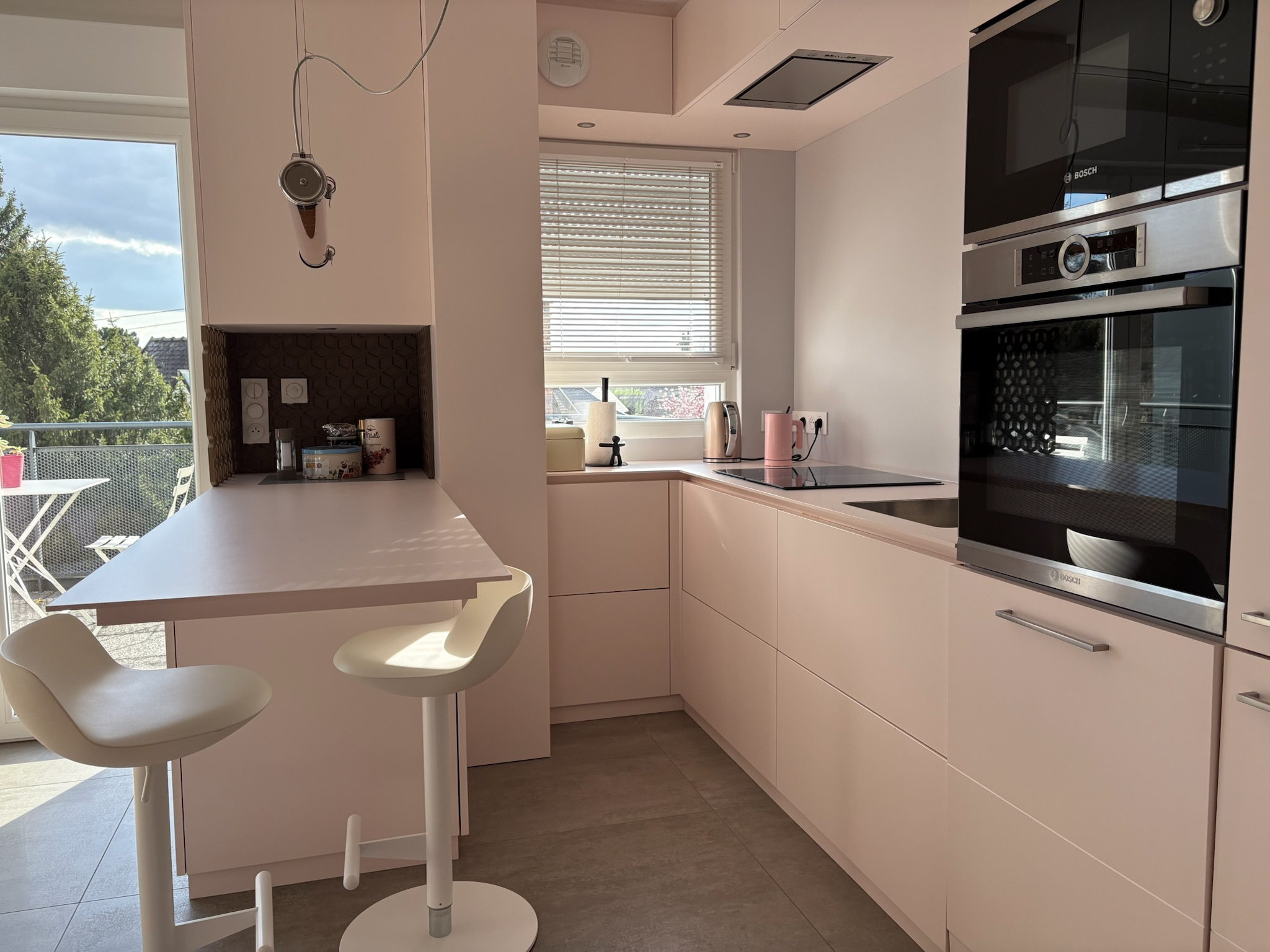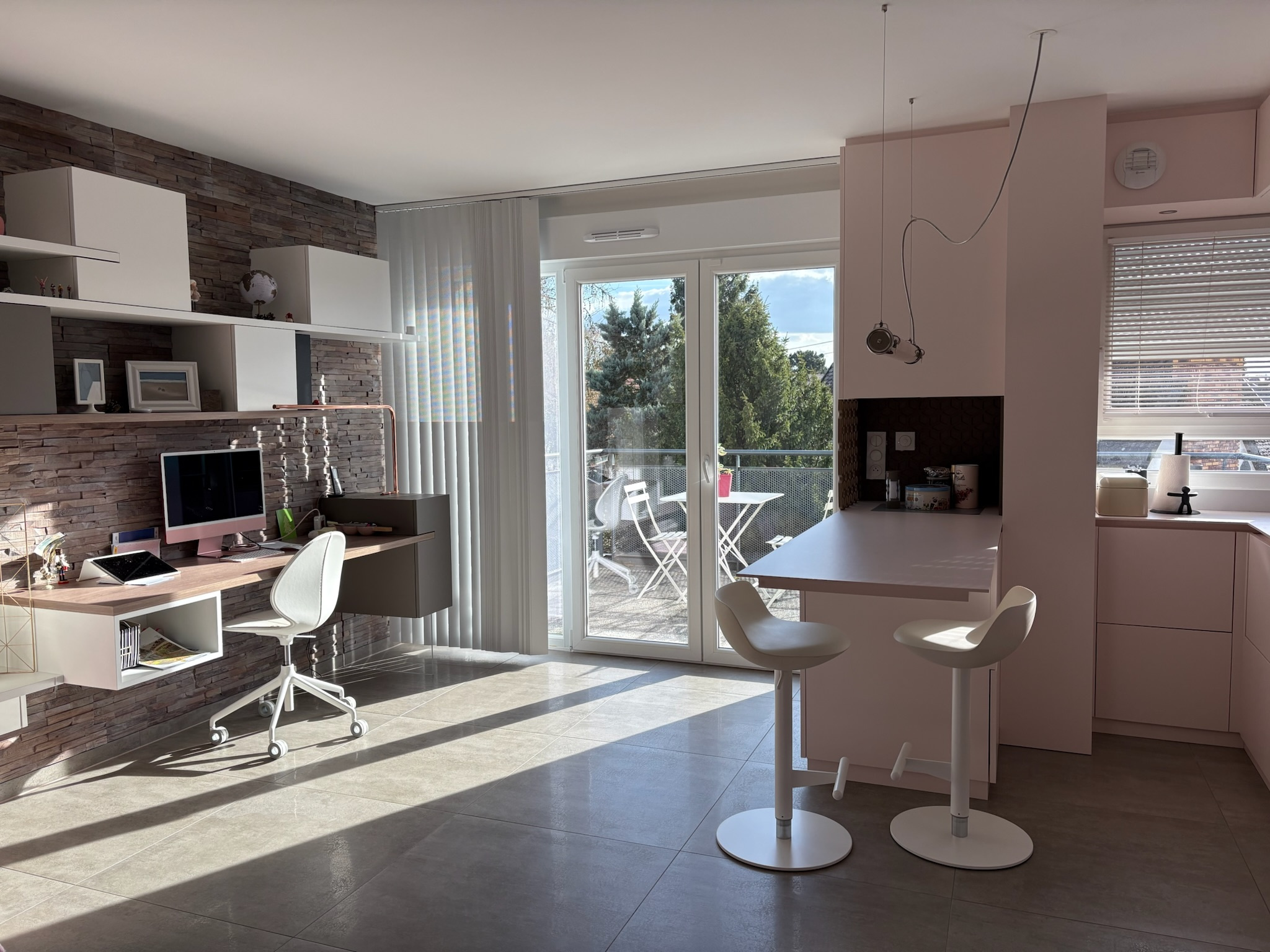 - Une pièce de vie ouverte sur une cuisine équipée (cuisine sur mesure avec électroménager four, plaque, hotte, lave-vaisselle). Une terrasse de 11,5m2 exposée plein sud et sans vis-à-vis est accessible depuis le séjour.